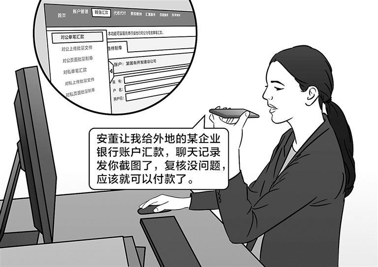 隨后,黃某某被拉入一個聊天群,并在該群收到備注名為安某某(該公司董事長)發(fā)來的消息,詢問黃某某是否接到銀行需要年檢的通知,并在聊天群中“安排公司相關(guān)工作”,這讓黃某某輕信了安某某的身份。隨即,安某某要求黃某某向外地某企業(yè)銀行賬戶匯款。